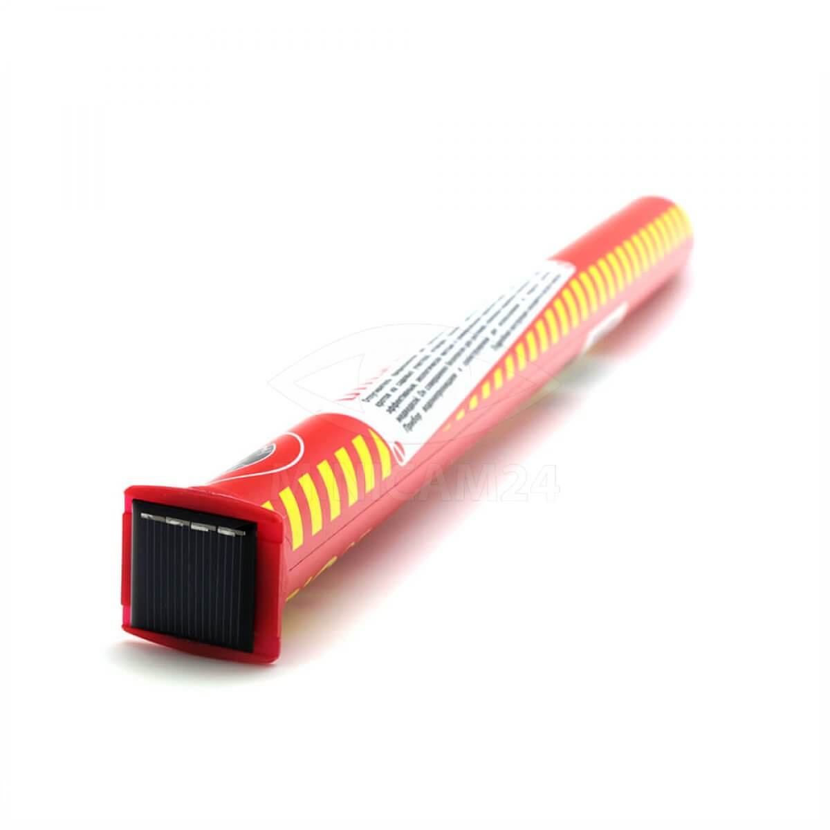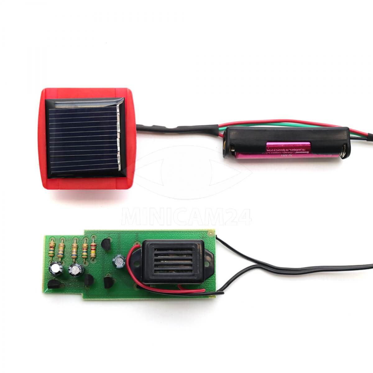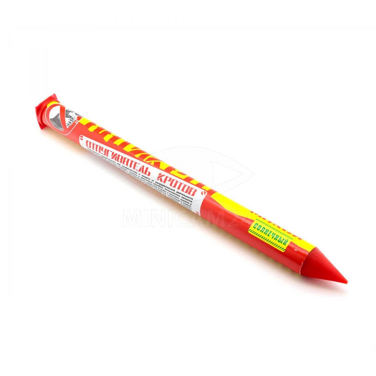 Отпугиватель содержит электромеханический вибратор с частотой колебаний в 400 Гц, действующий в периодическом кратковременном режиме. Колебания такой частоты, распространяясь в почвенном слое, действуют на кротов раздражающе. Прибор выполнен в виде колышка и устанавливается в центре земельного участка, который необходимо защитить от кротов. Прибор гарантированно изгоняет гротов на площади 8000 м. кв. Питается прибор от смонтированной в верхней части солнечной батареи.